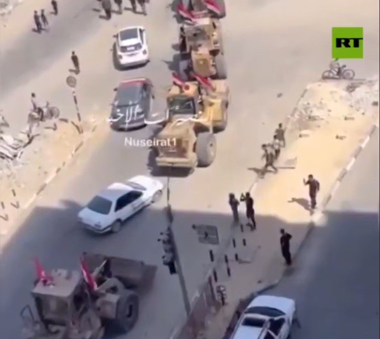 Gaza cleanup and reconstruction begins as Egypt sends a brigade of bulldozers to begin clearing rubble in Gaza, seen here entering through Rafah – credit video frame shot from Russia Today
