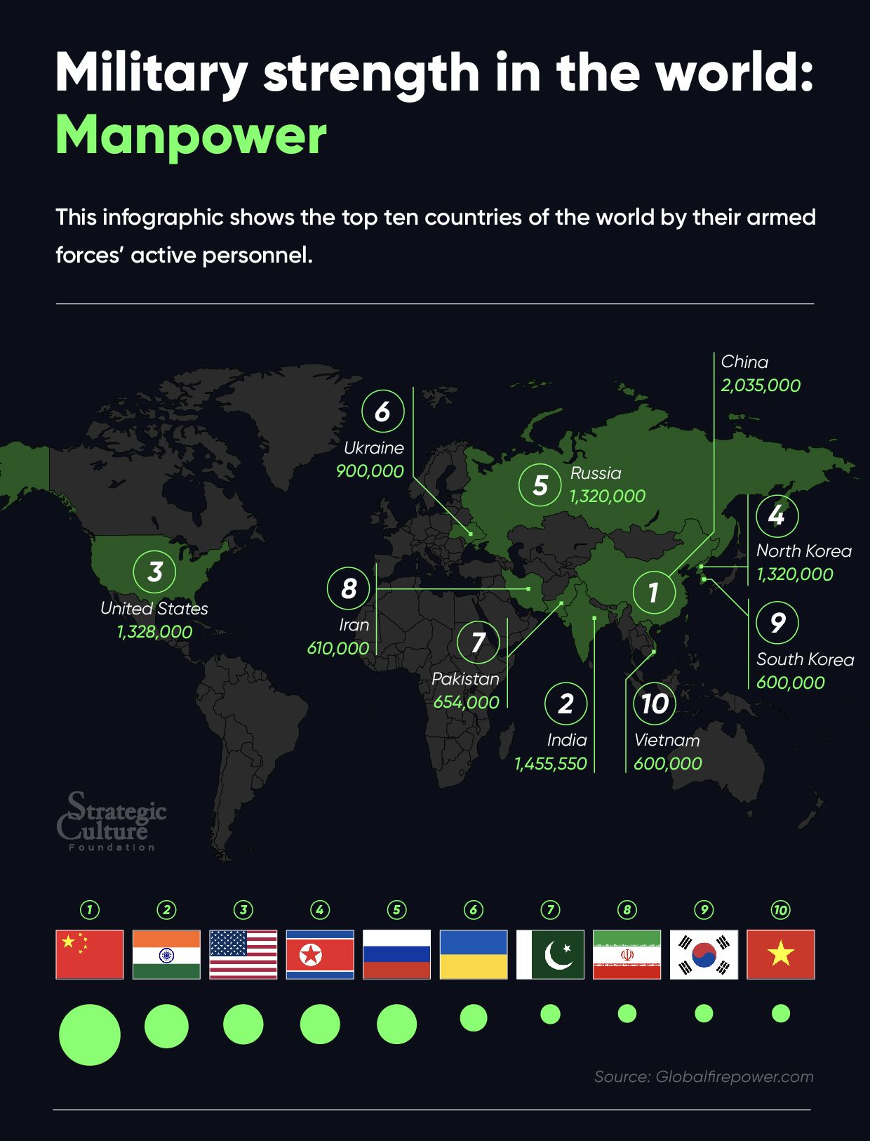 This infographic shows the top ten countries of the world by their armed forces’ active personnel