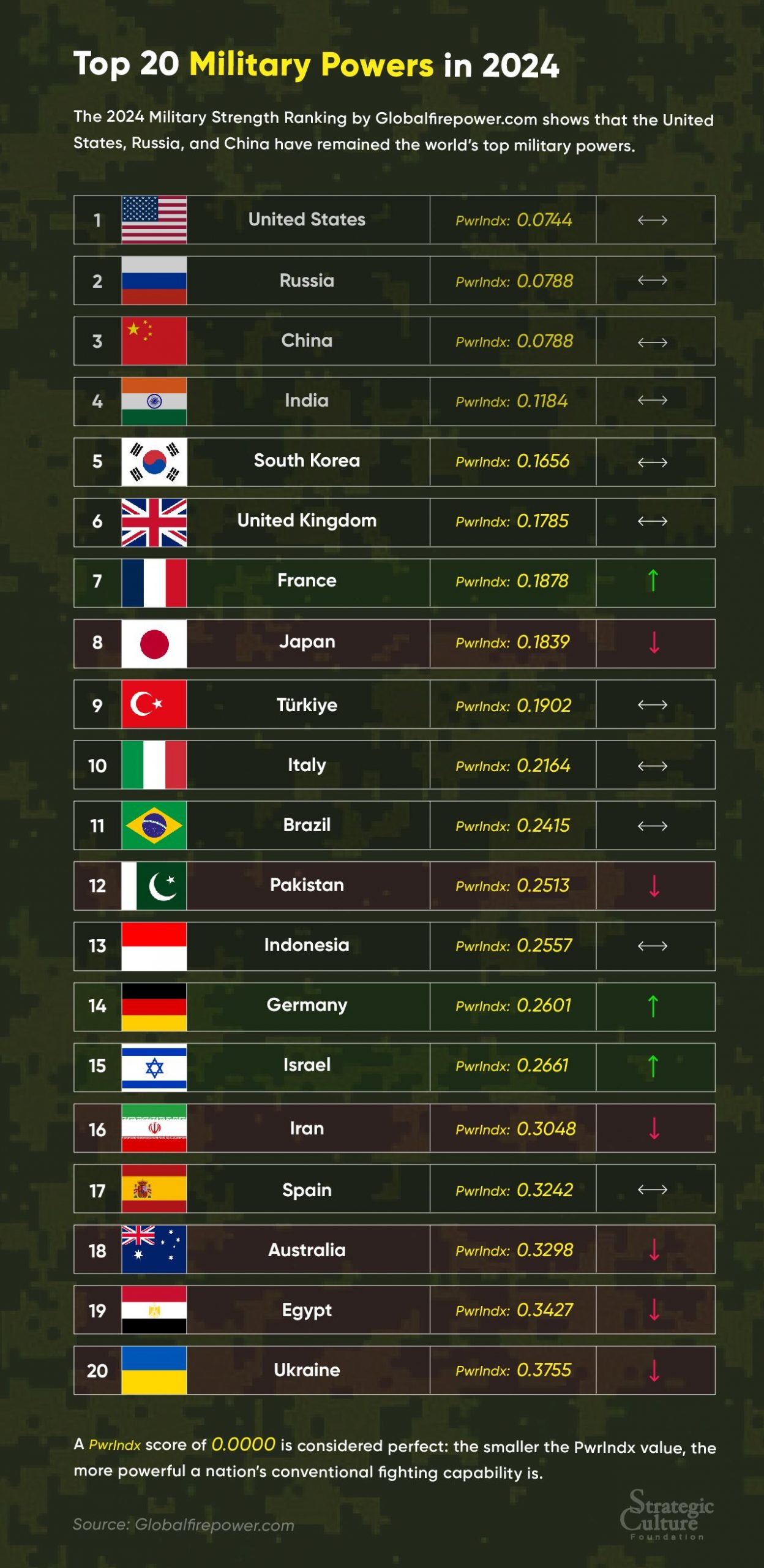 The 2024 Military Strength Ranking by Globalfirepower.com shows that the United States, Russia, and China have remained the world’s top military powers.