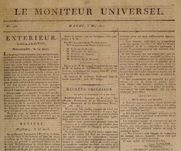 Le Moniteur universel, fue el diario parido por la Revolución francesa en 1789 y cuando Napoleón se convirtió en emperador, fue el órgano de propaganda de su régimen. Como se aprecia en la increíble digitalización del diario francés disponible en la página Internet Archive, el diario cubría varios frentes: asamblea nacional, política exterior e interior, administración, literatura y ciencia. Se pueden apreciar allí las resoluciones del gobierno, así como edictos de Napoleón, “Décrets Impériaux”, como el emitido el 4 de mayo de 1812, en referencia a diversos temas.