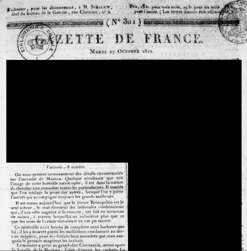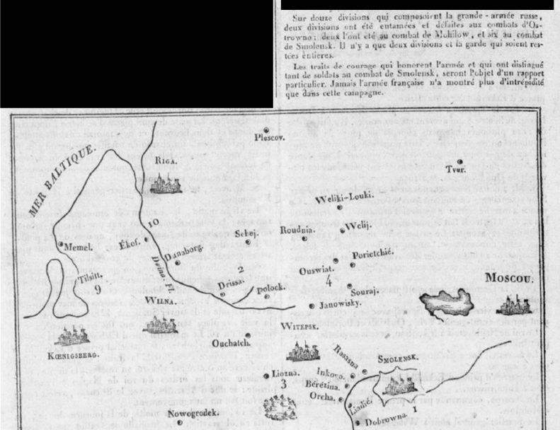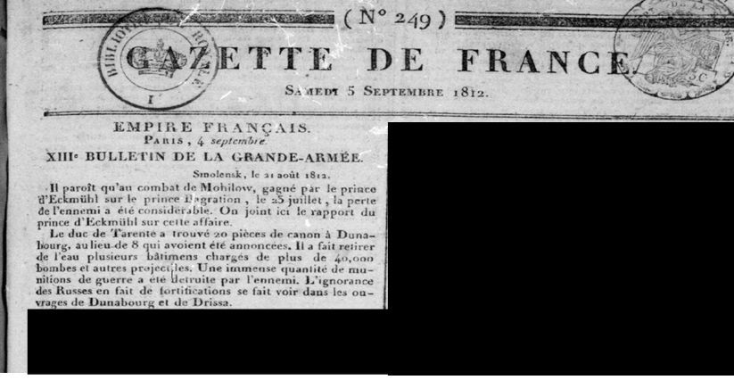 El diario Gazette de France, –de la cual encontré el repositorio completo digitalizado en el portal Gallica– también presenta un desfase entre la fecha de publicación y las fechas de las informaciones que publica. Por ejemplo, para el 5 de septiembre de 1812, fecha en que Napoleón entra a Borodino, la Gazette informa sobre un boletín de la Grande Armée del 21 de agosto de 1812, emitido en Smolensk. Este diario detalla mapas de avance territorial de la ofensiva napoleónica, haciendo referencia a la batalla de Smolensk librada entre el 16 y el 18 de agosto.