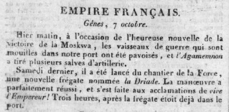— Cartas procedentes de Vilna indican que Su Majestad el Emperador, el 3 de este mes, se encontraba a tan solo veinte leguas de la ciudad donde se le esperaba. El regreso del ejército es totalmente completo; se han librado varias batallas en las que se han obtenido importantes victorias contra los rusos, quienes sufrieron numerosas bajas. El Emperador sigue gozando de excelente salud.