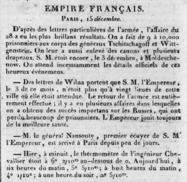Según cartas privadas del ejército, el asunto del 28 tuvo resultados brillantes. Entre 9.000 y 10.000 prisioneros fueron capturados del cuerpo de los generales Tschilschagoft y Wittgenstein. También se capturaron cañones y varias banderas. Su Majestad se encontraba aún, el 3 de diciembre, en Moldeschenow. Se esperan informes oficiales de estos afortunados acontecimientos en breve.