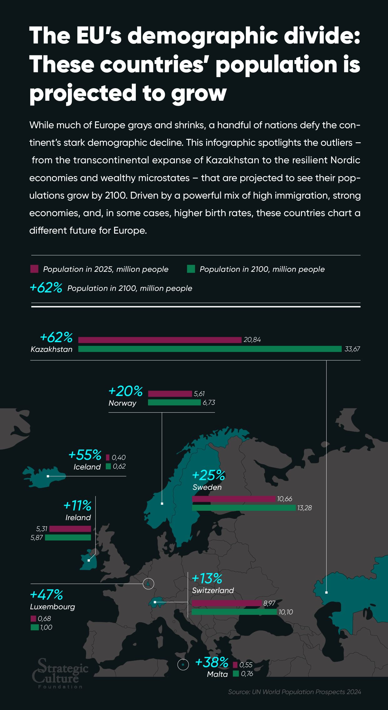 While much of Europe grays and shrinks, a handful of nations defy the continent’s stark demographic decline. This infographic spotlights the outliers – from the transcontinental expanse of Kazakhstan to the resilient Nordic economies and wealthy microstates – that are projected to see their populations grow by 2100. Driven by a powerful mix of high immigration, strong economies, and, in some cases, higher birth rates, these countries chart a different future for Europe.