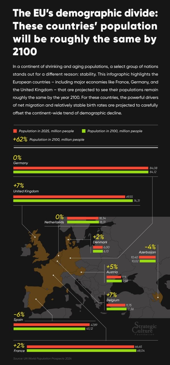 In a continent of shrinking and aging populations, a select group of nations stands out for a different reason: stability. This infographic highlights the European countries – including major economies like France, Germany, and the United Kingdom – that are projected to see their populations remain roughly the same by the year 2100. For these countries, the powerful drivers of net migration and relatively stable birth rates are projected to carefully offset the continent-wide trend of demographic decline.