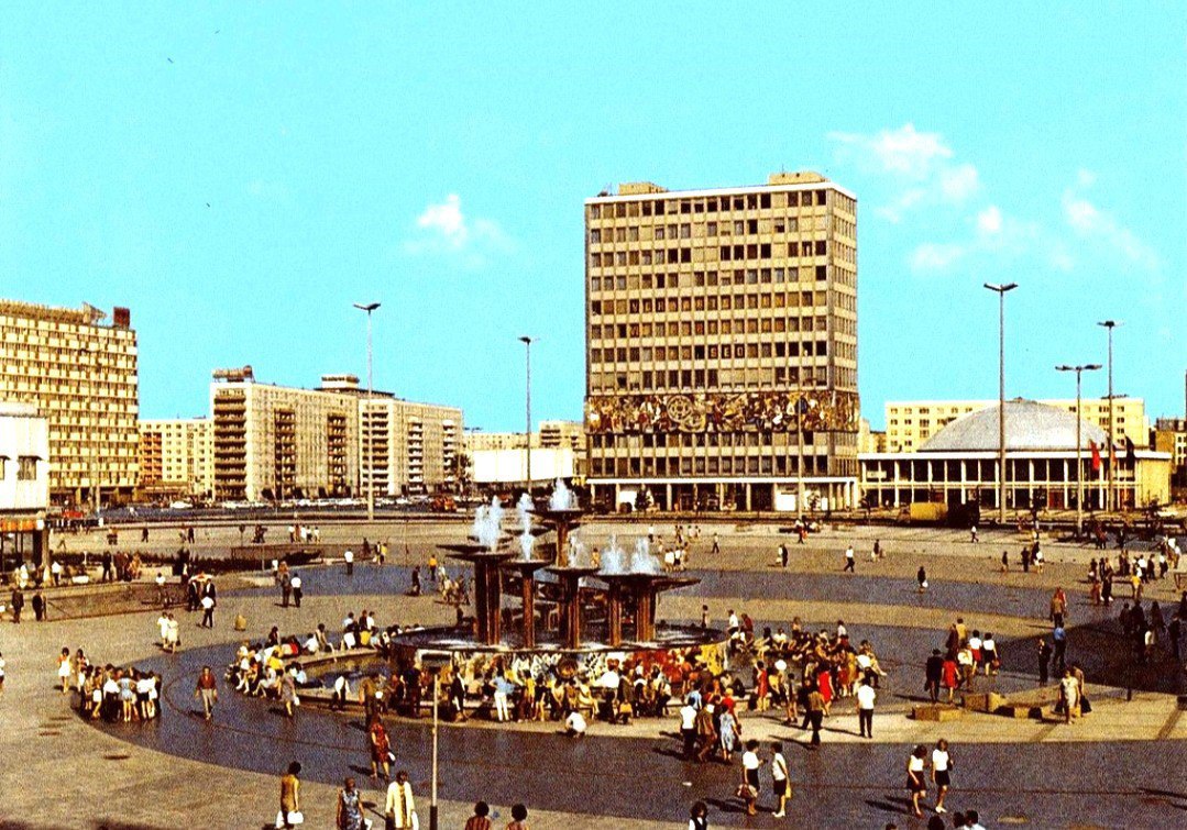 La piazza infatti, dopo le devastazioni del secondo conflitto mondiale, rinasce nella seconda metà degli anni ‘60 con un progetto urbanistico complessivo in cui i prospettati palazzi modernisti attorniano un grande spazio urbano pedonale, a tutti gli effetti una piazza socialista, orgogliosamente capace di ospitare un numero considerevole di persone, anche alcune migliaia, come durante il decimo Festival Mondiale della Gioventù e degli Studenti nell’estate 1973.