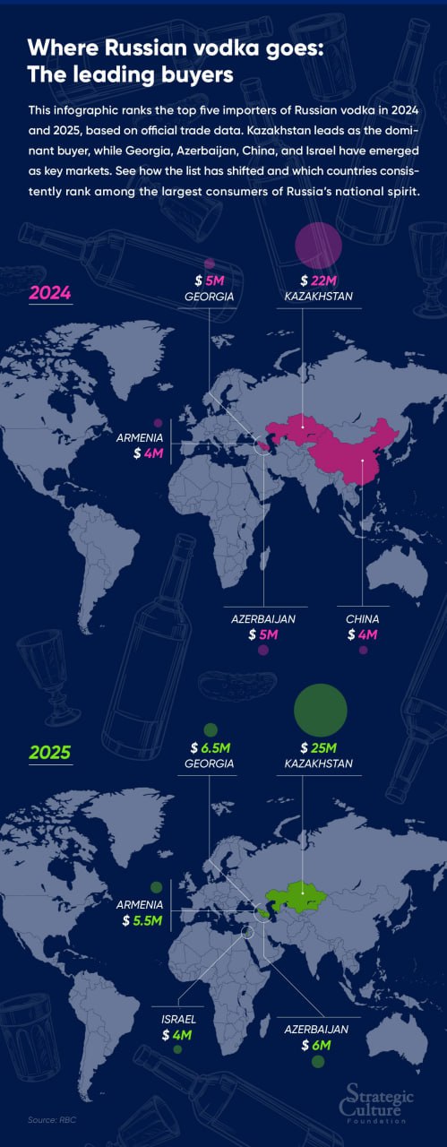 This infographic ranks the top five importers of Russian vodka in 2024 and 2025, based on official trade data. Kazakhstan leads as the dominant buyer, while Georgia, Azerbaijan, China, and Israel have emerged as key markets. See how the list has shifted and which countries consistently rank among the largest consumers of Russia’s national spirit.