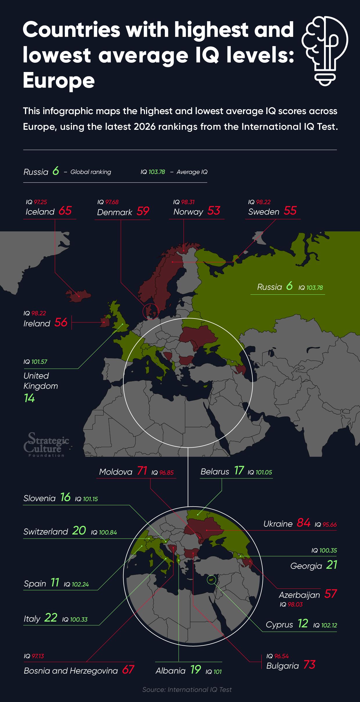 This infographic maps the highest and lowest average IQ scores across Europe, using the latest 2026 rankings from the International IQ Test.